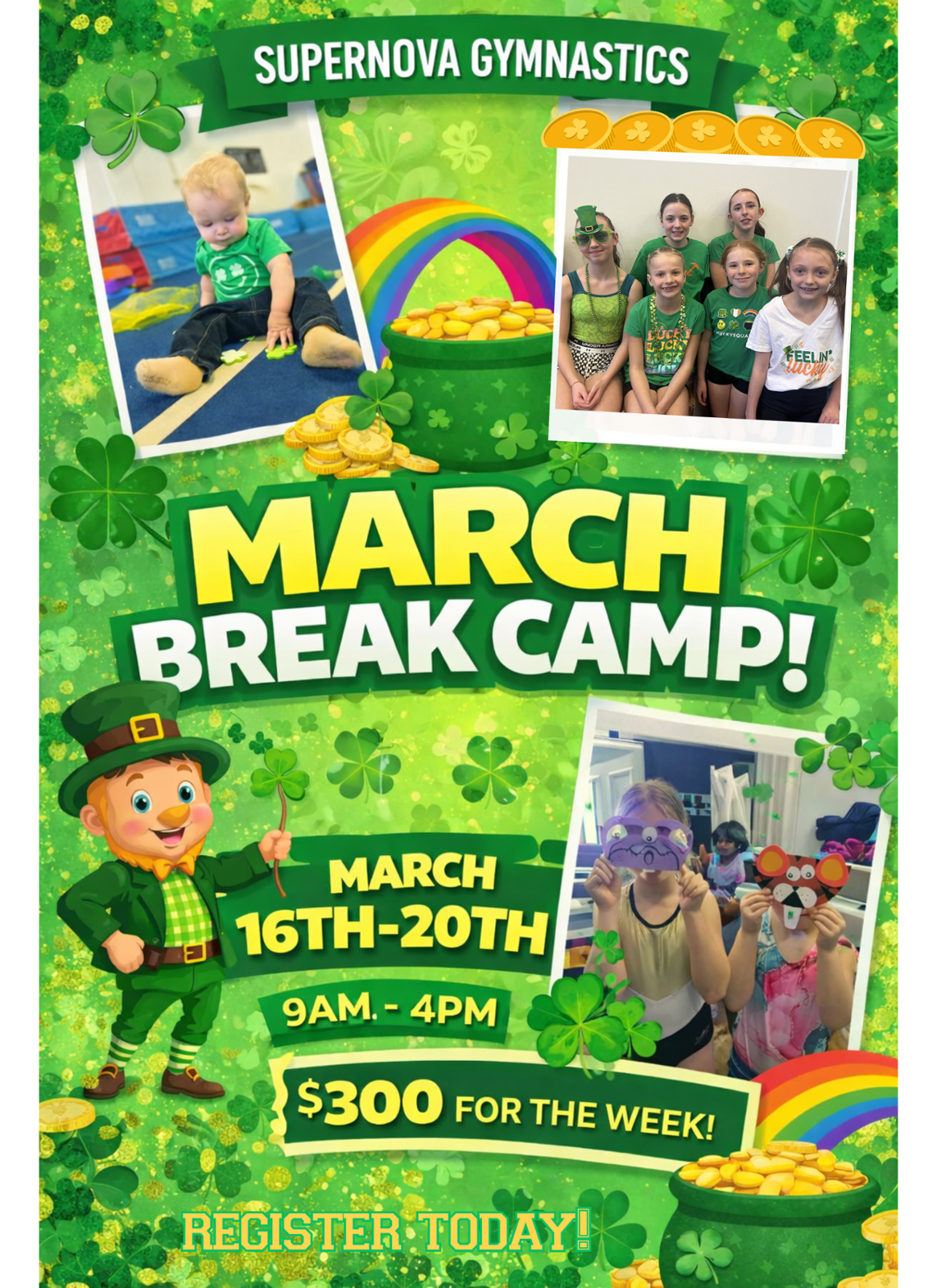 9-4pm Includes gymnastics, crafts, open gym, games, Pizza and a drink for each child.